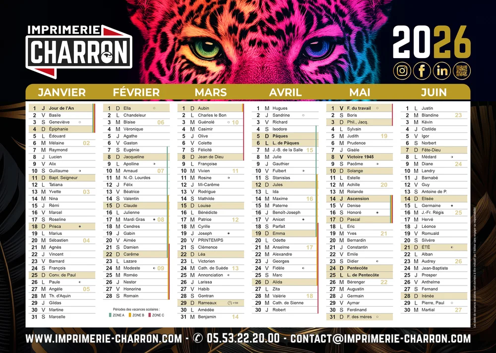 Imprimerie Charron, votre spécialiste en impression numérique à Bergerac, est ravi d'annoncer l'arrivée des calendriers 2026 ! Que vous soyez une entreprise cherchant à offrir un cadeau personnalisé à vos clients ou un particulier souhaitant organiser votre année, nos calendriers sont conçus pour répondre à vos besoins avec style et efficacité.